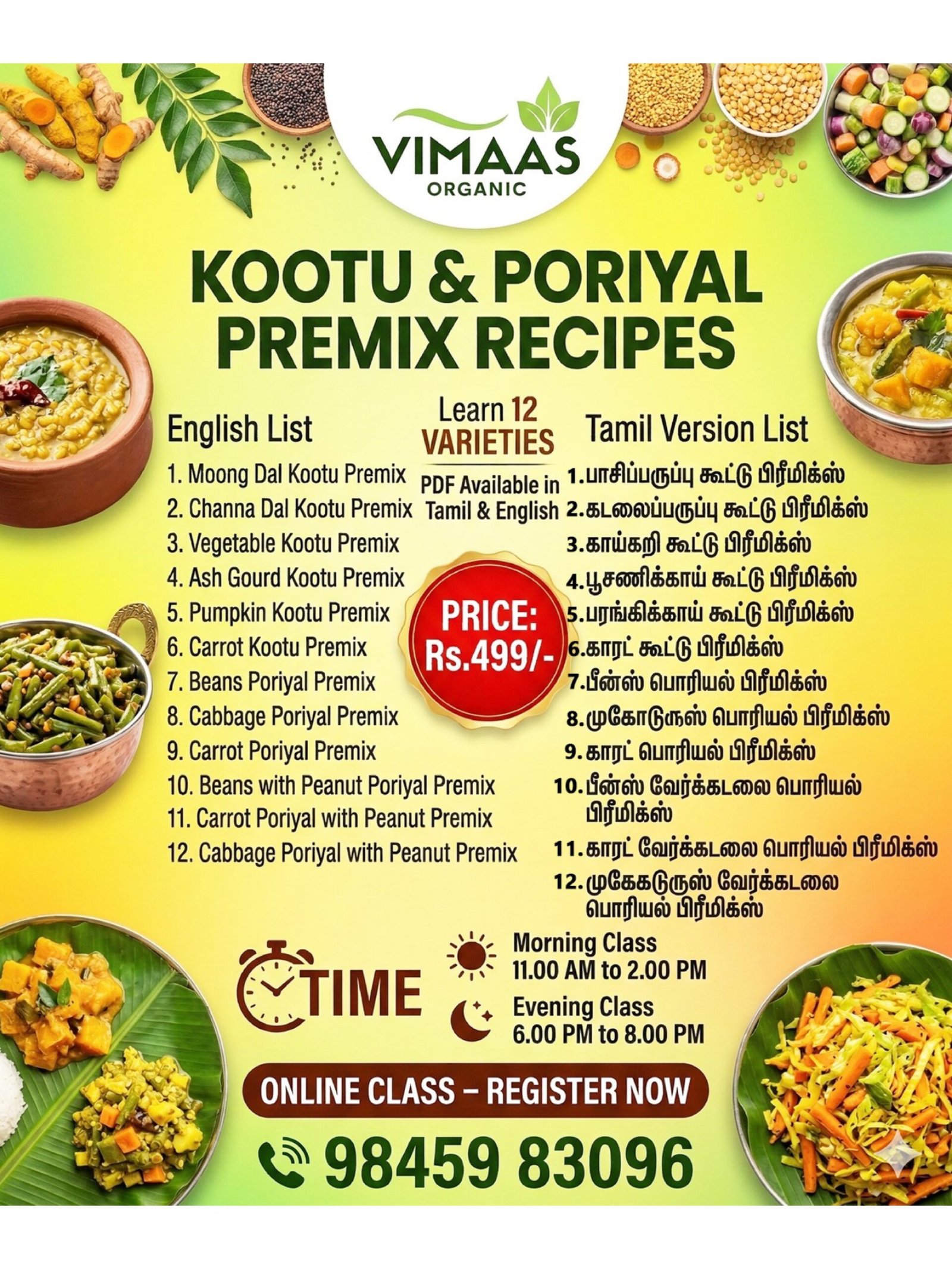 Learn the secrets of authentic South Indian home cooking with our Koottu & Poriyal Premix Recipe Class. Perfect for food enthusiasts and beginners alike, this class empowers you to create nutritious and delicious dishes with ease.