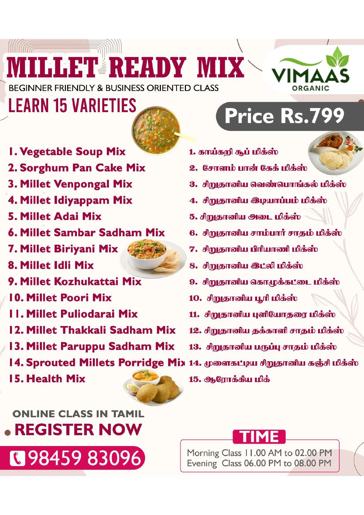 The Millet Ready Mix Class is designed for anyone seeking delicious, nutritious, and easy meal solutions. This ready mix offers a healthier alternative to traditional flours and mixes, featuring millets that are packed with essential nutrients like fiber, protein, and antioxidants to support your wellbeing.