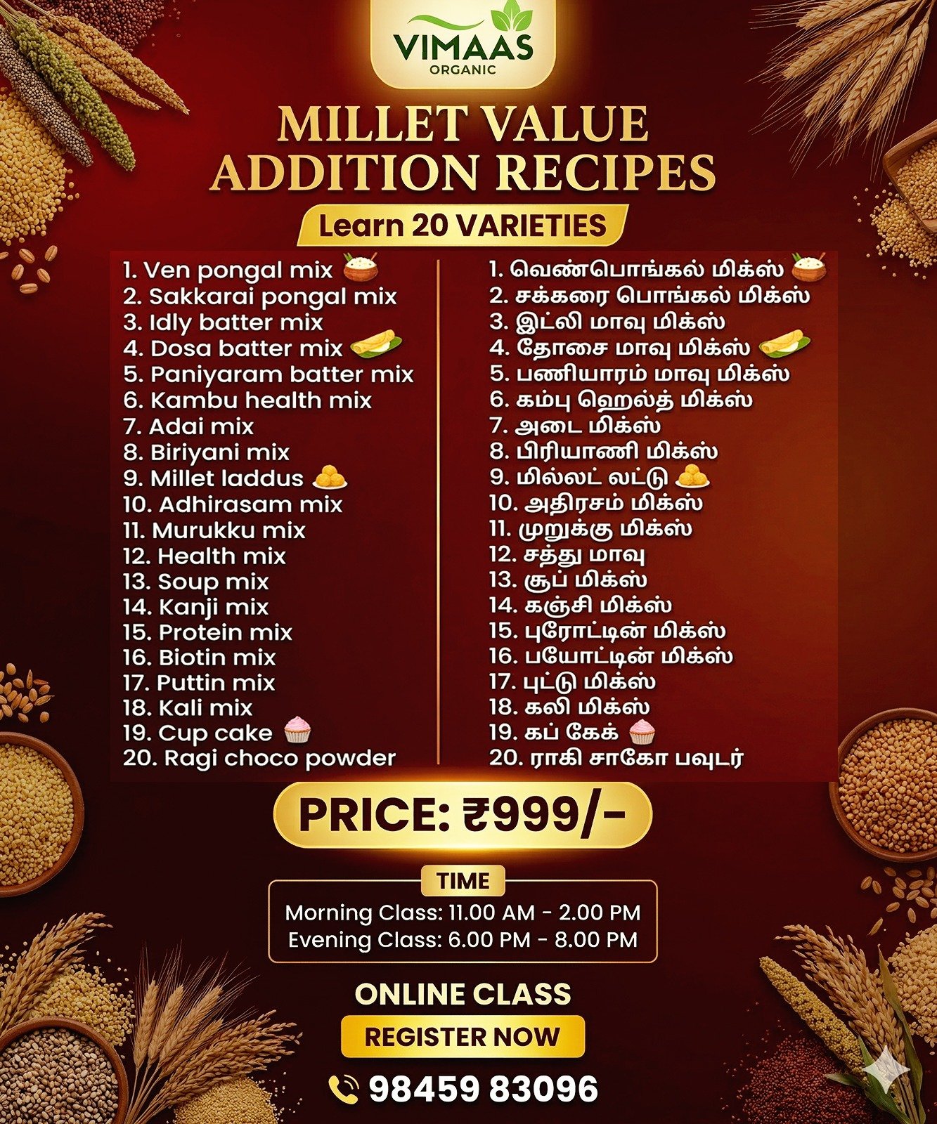 Millets are not just versatile; they are eco-friendly and packed with health benefits. By joining our class, you’ll learn techniques to highlight their unique properties, creating products that are both appealing and beneficial for your target audience.