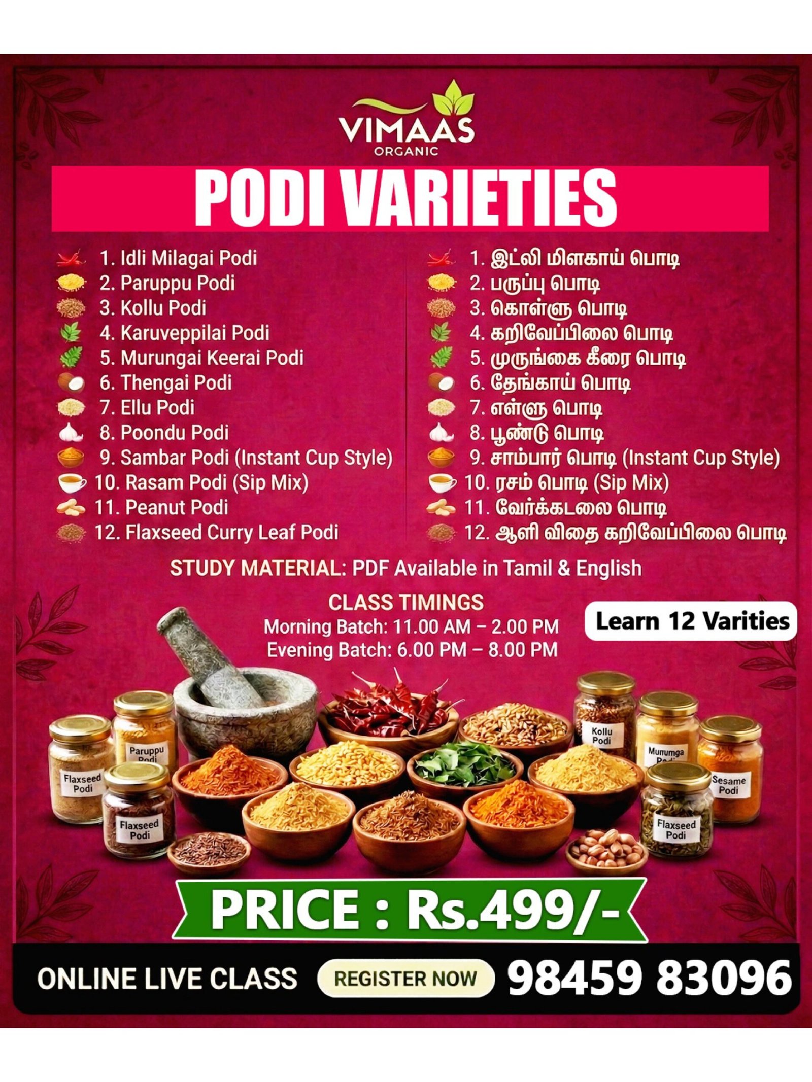 Embark on a flavorful journey with our Podi Varieties Class. Perfect for food enthusiasts, this interactive session introduces you to a range of traditional Podi powders, famous for their rich aromas and versatile uses in Indian cuisine.