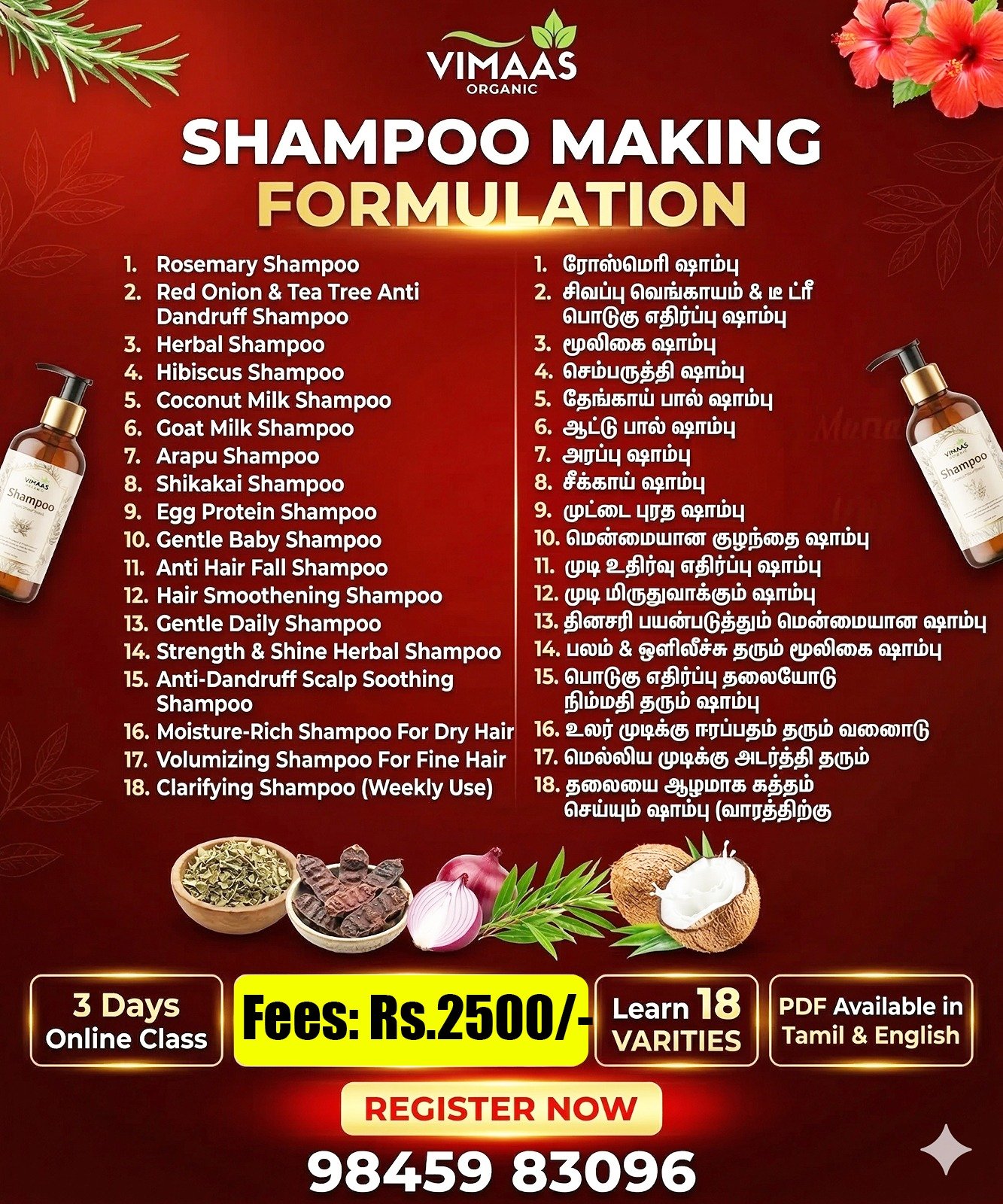 Discover the science and art behind crafting effective and eco-friendly shampoos in our exclusive formulation class. Perfect for beginners and enthusiasts, this workshop helps you understand ingredients, techniques, and processes that build high-quality haircare solutions tailored to your needs.